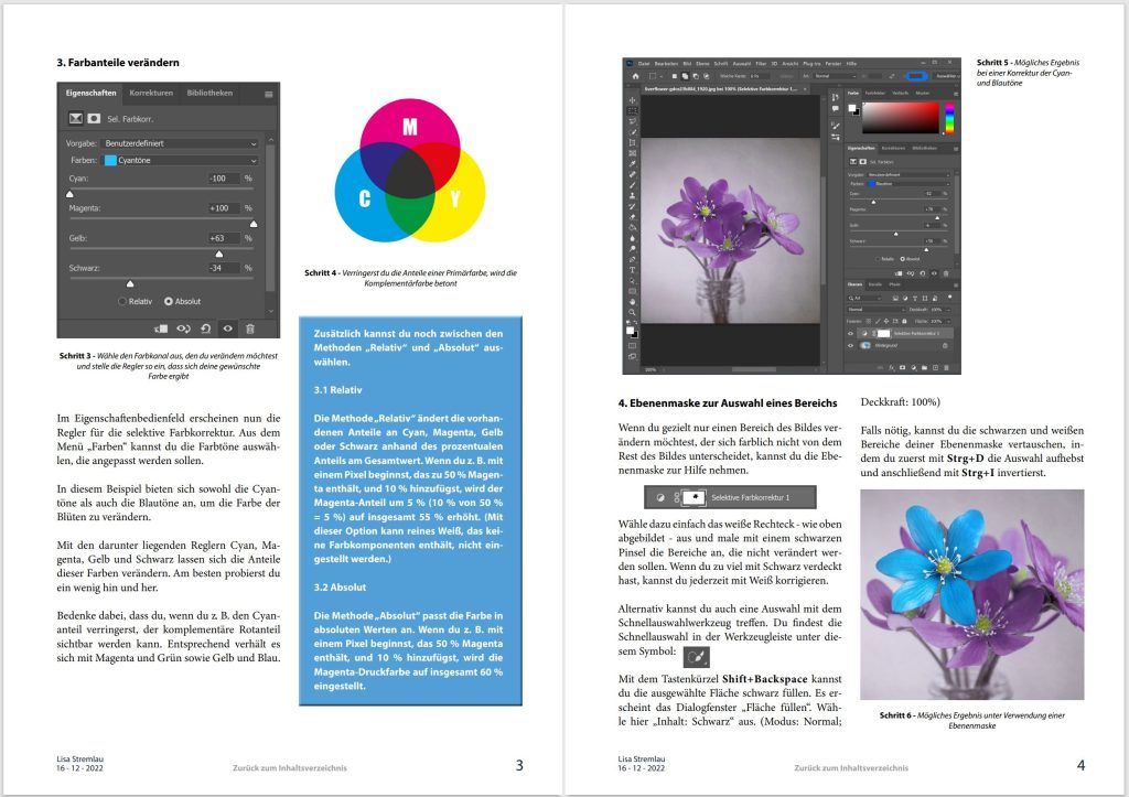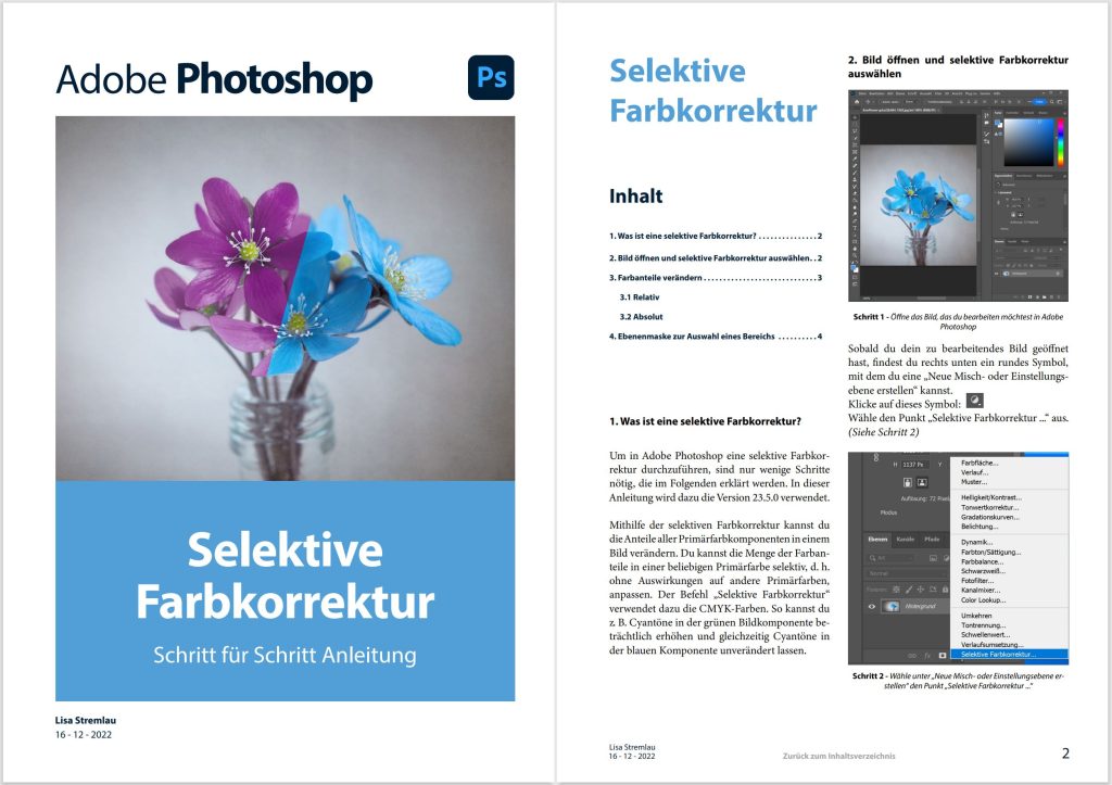 Die Arbeitsanweisung behandelt das Thema Selektive Farbkorrektur in Adobe Photoshop und ist als interaktive PDF-Datei angelegt.