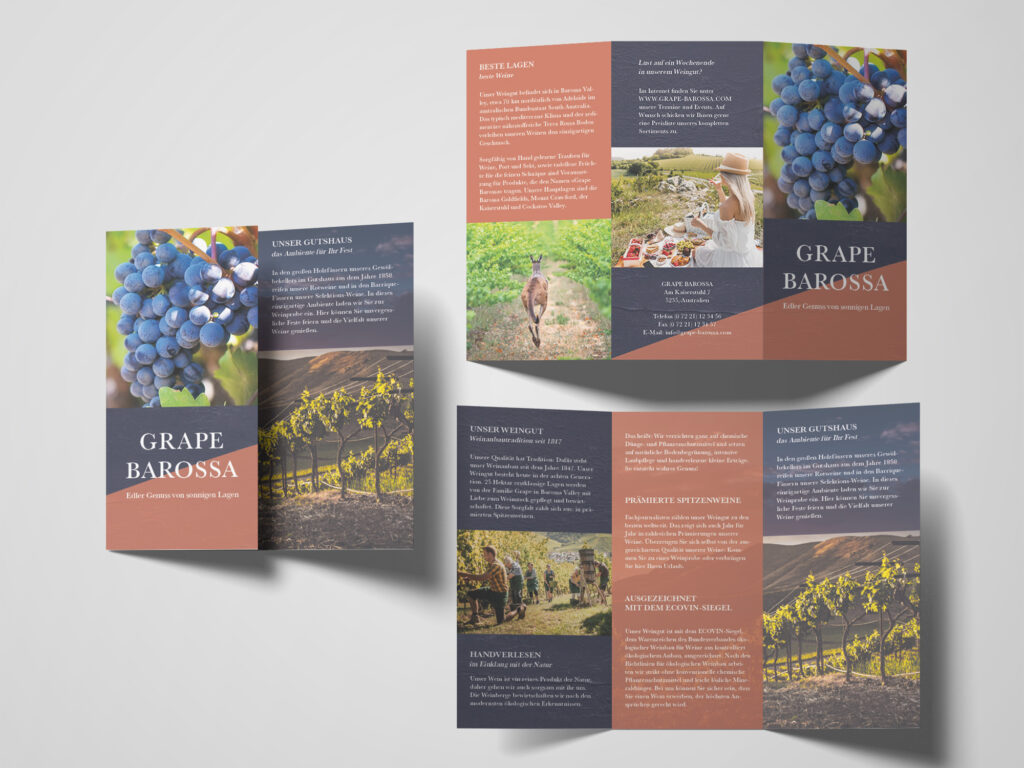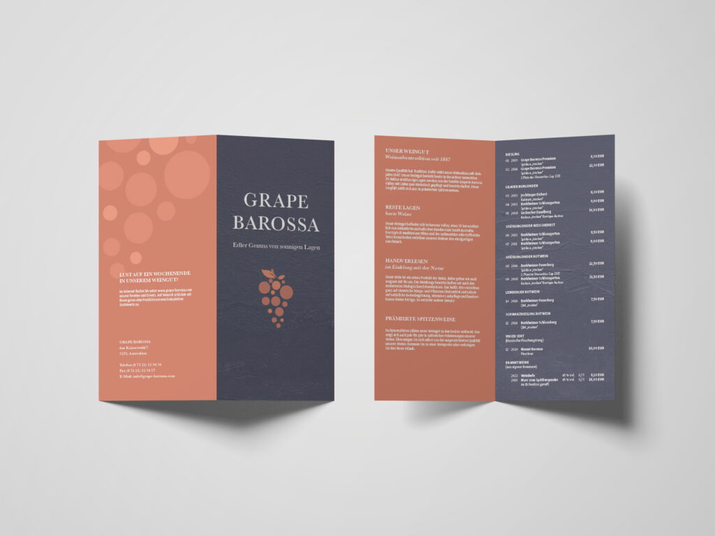 Dieser Flyer wurde für das australische Weingut „Grape Barossa“ gestaltet. Die genauen Anforderungen und weitere Details über die Gestaltung, kannst du in der Dokumentation nachlesen: