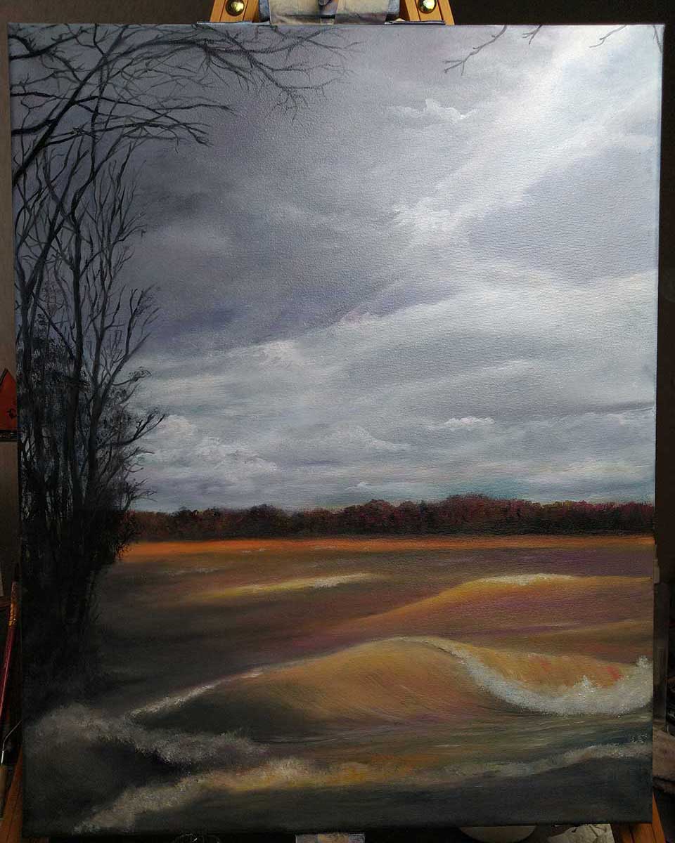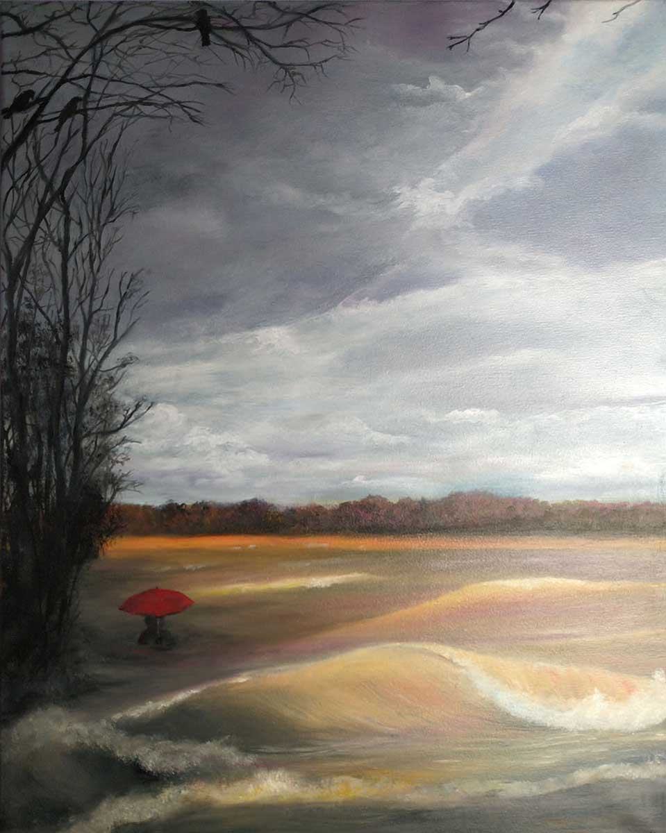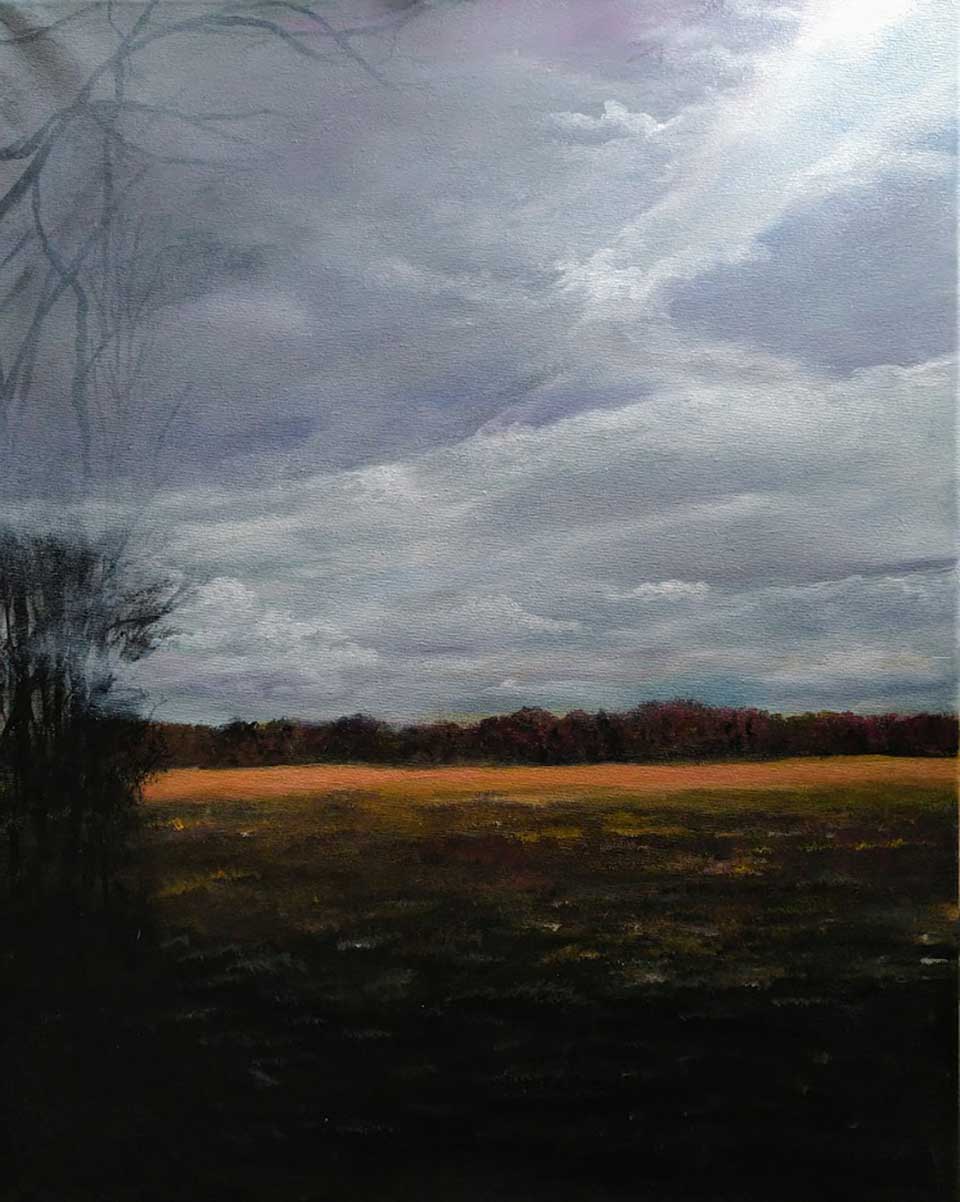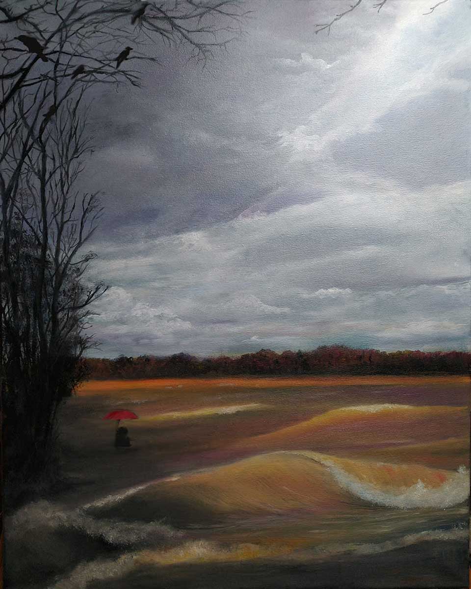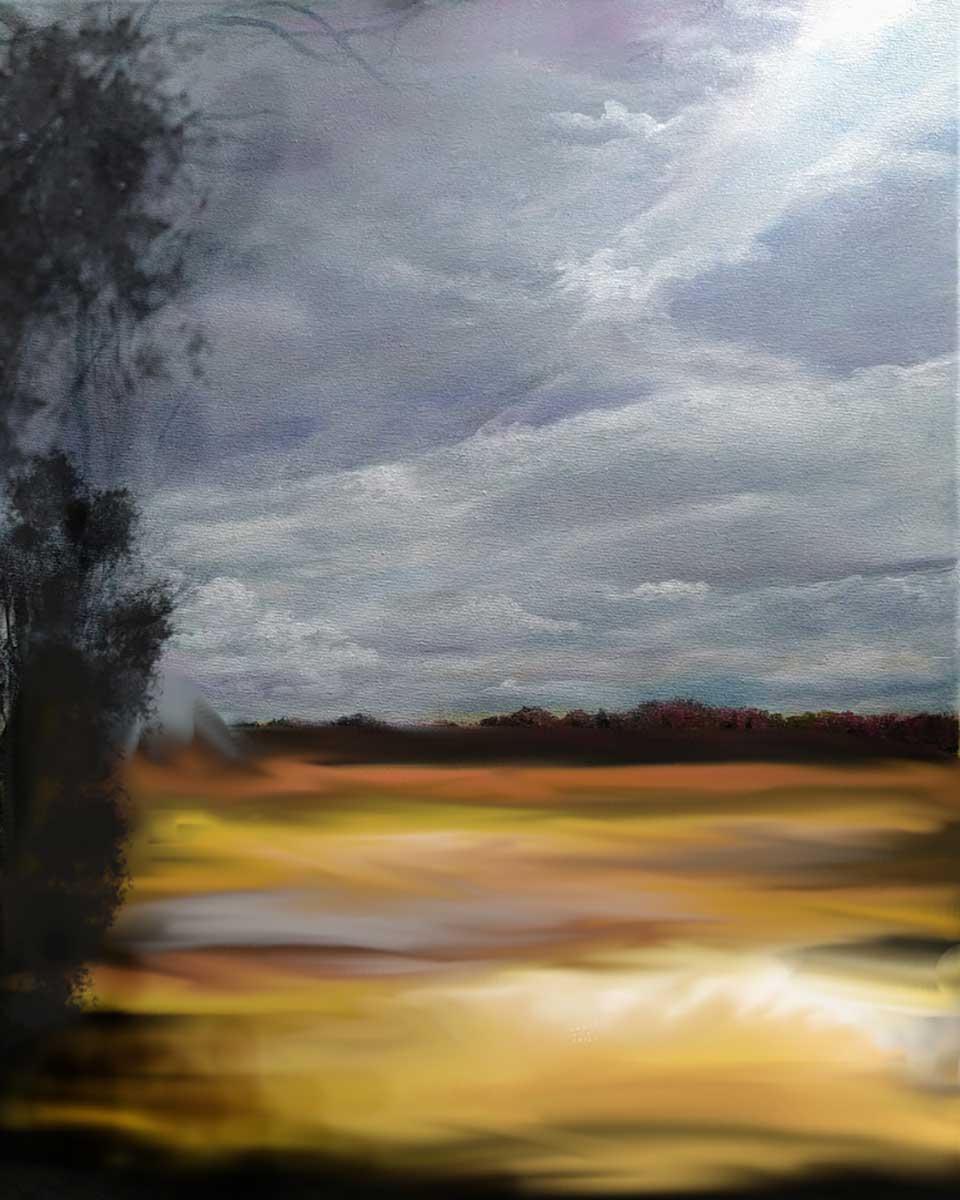 Wenn du dir die einzelnen Bilder ansiehst, erkennst du nicht nur verschiedene Stadien dieses Gemäldes, sonder auch Skizzen, die ich mit Gimp gemacht habe, um eine Vorstellung davon zu bekommen, wie es wohl aussehen würde, wenn ich, statt einem normalen Feld, Wellen male - wie Vögel in den Ästen aussehen könnten - wie eine Person mit Regenschirm die Wirkung des Bildes verändert...
