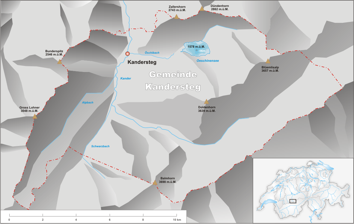 Der Oeschinensee liegt oberhalb von Kandersteg (Berner Oberland) in der Schweiz. Der Wasserspiegel liegt durchschnittlich auf einer Höhe von 1578 m. Der See ist bei normalem Wasserstand 56 m tief und hat eine Fläche von 1,1 km², womit er zu den grösseren Bergseen in der Schweiz gehört. Er entstand durch mehrere Bergrutsche der Flanken des Fründenhorns und des Doldenhorns.